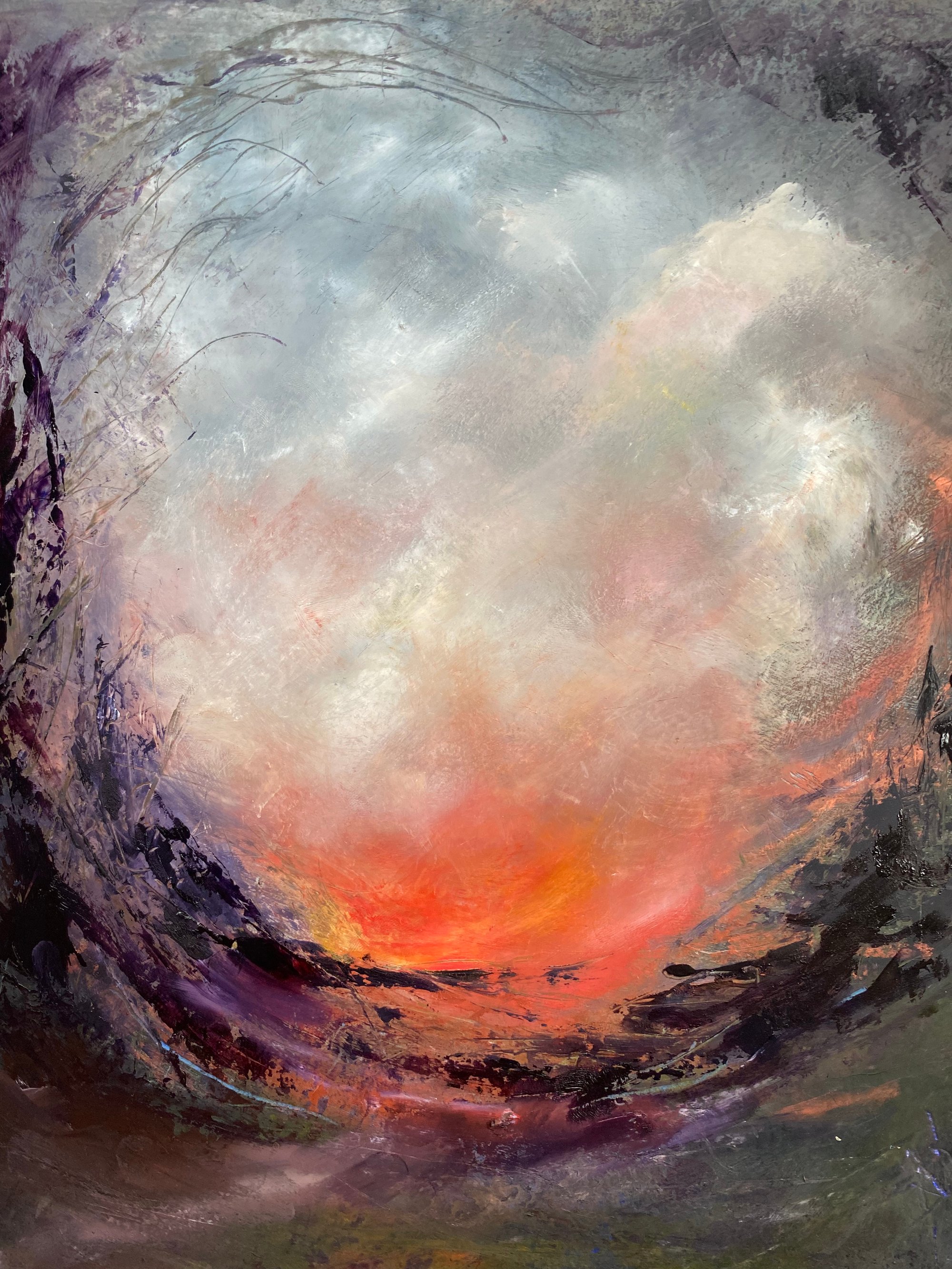 Oils and cold wax on Arches oil paper 300mg mounted on board . 14”x14” . Professionally framed in a white tray frame .